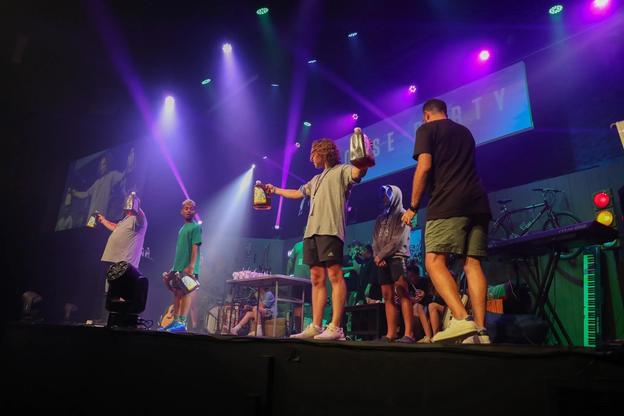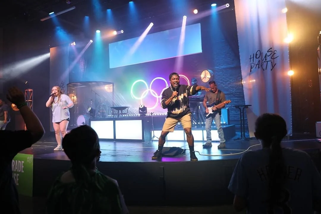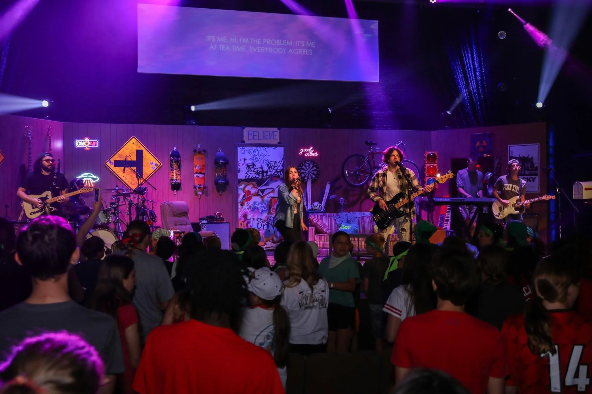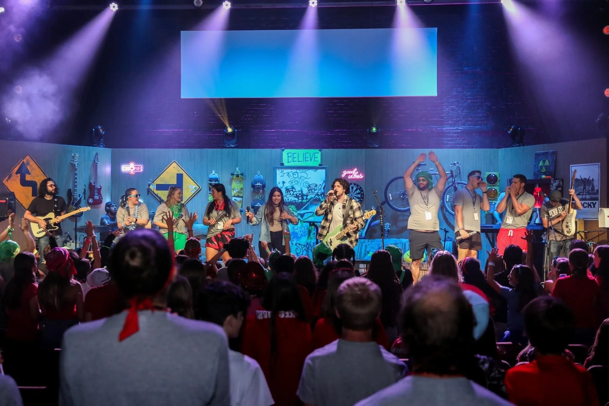 Best part of my summer! The theme for the first year of our revamped middle school camp was “Family,” we had an awesome garage-band style set and it was super fun to help put together as it was so inexpensive! I designed and setup all of the lighting (Including Elation Dartz 360 rentals). I also took care of outdoor sound, and the other areas of tech for each of the “houses” by adding lights, and updating some unused areas!