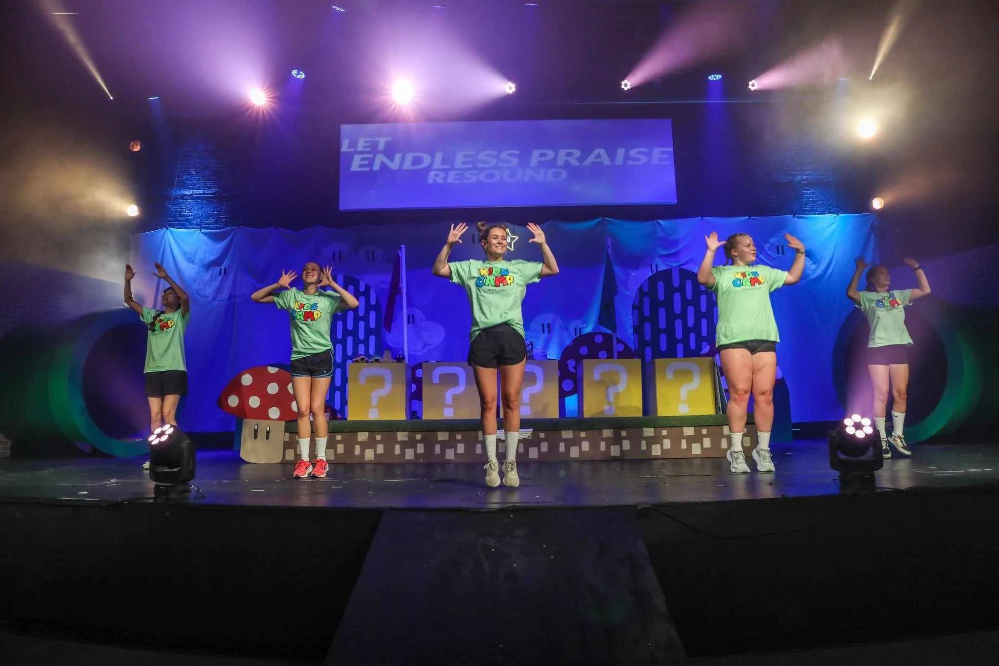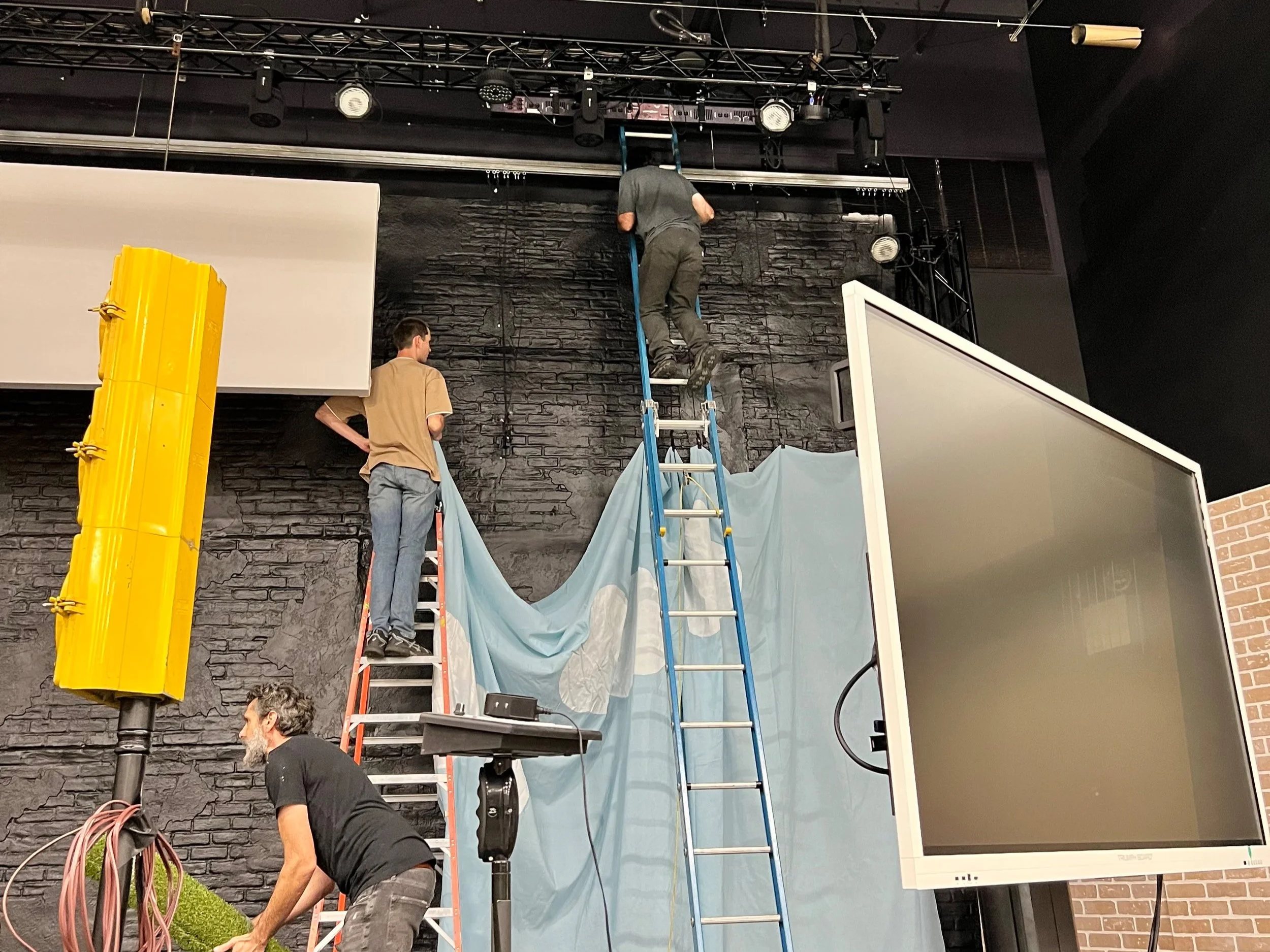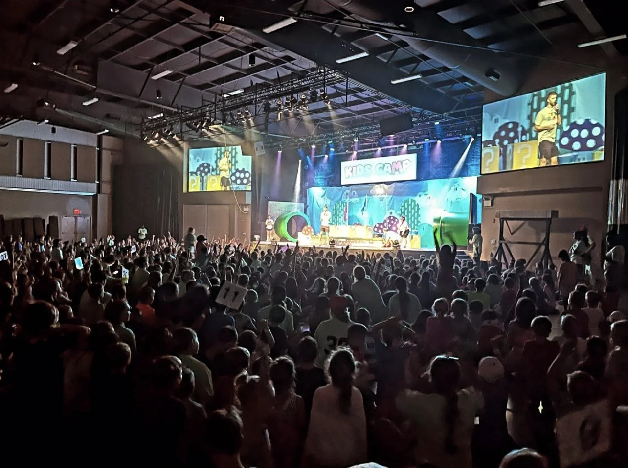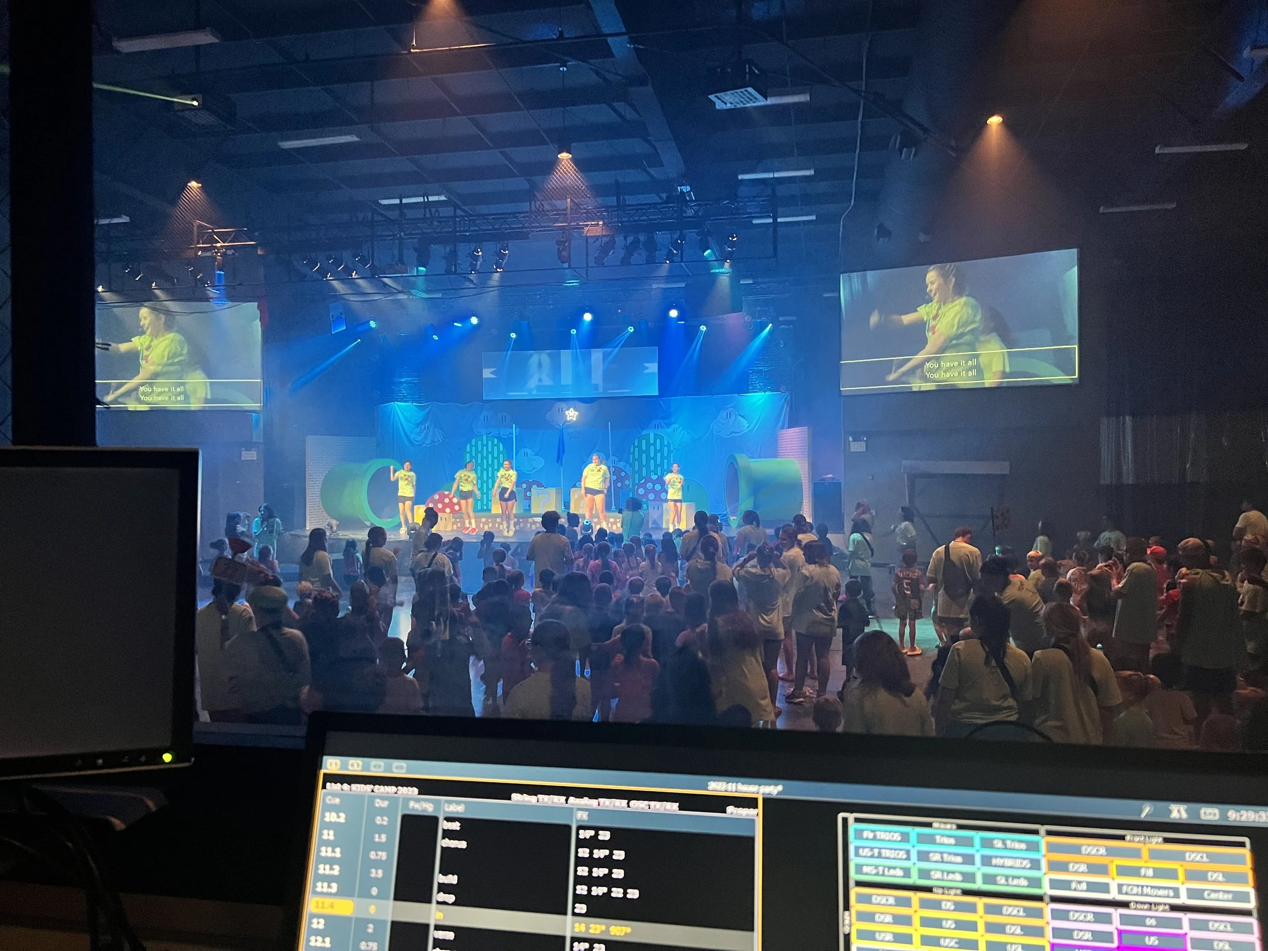 This year’s theme was Unplugged! I helped to program certain lighting segments, this was my first kids camp on production! I had really started to learn how to use the lighting board and use the faders, and time based cues. I designed and set up the outdoor stage system every single day, it consisted of a mixture of equipment from our children’s building.