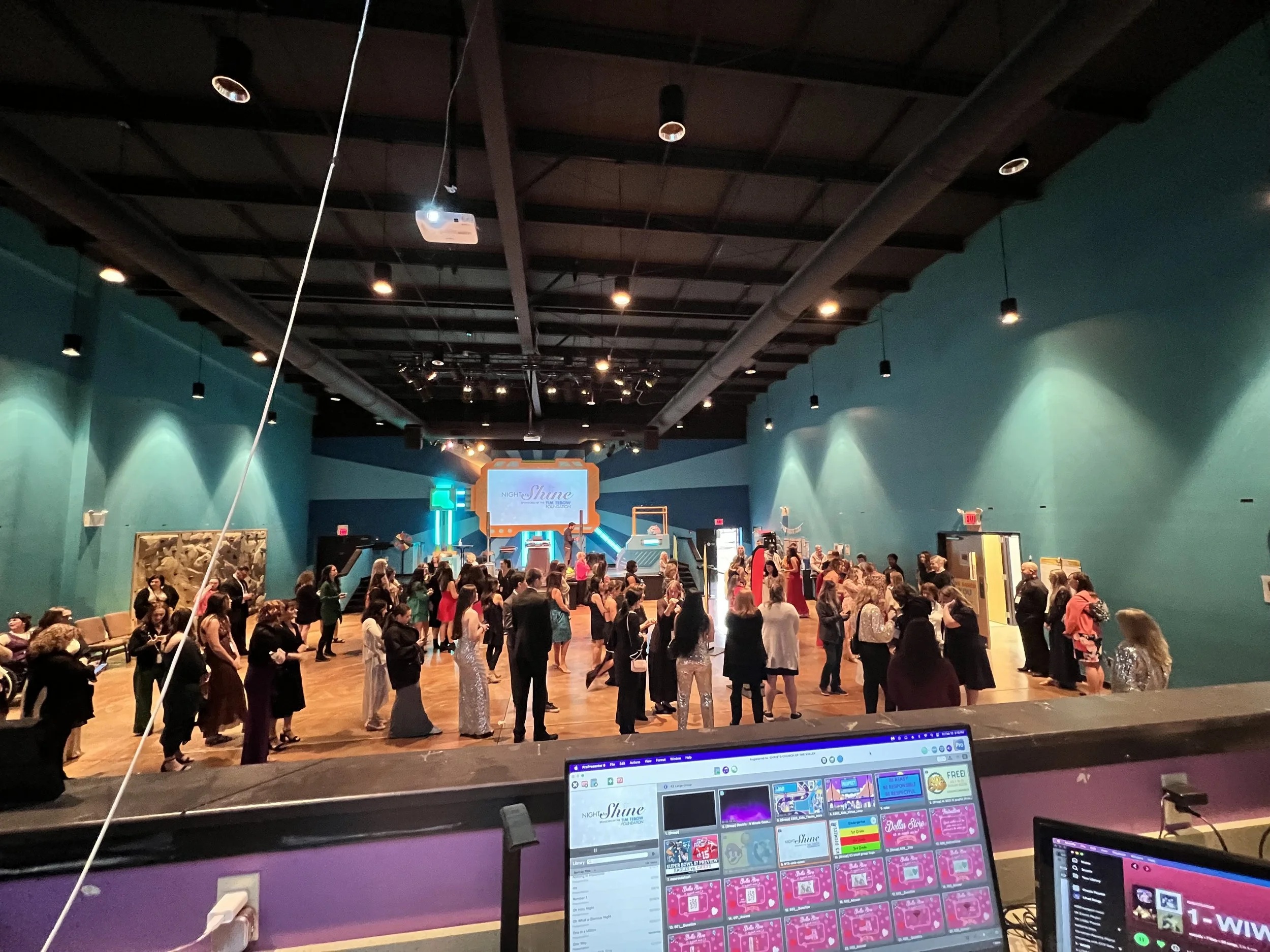 Night to Shine is a prom for those with special needs or care, it is hosted by the Tim Tebow Foundation at churches all over the World, it is such an awesome event. This year I was able to help design/program lighting for the “Dance Floor” DJ segments of the night, set up the outdoor system and some lighting for the Red-Carpet walk into the “Ballroom,” I also helped set up tech for the parent room and the karaoke room! Love this event and the atmosphere!